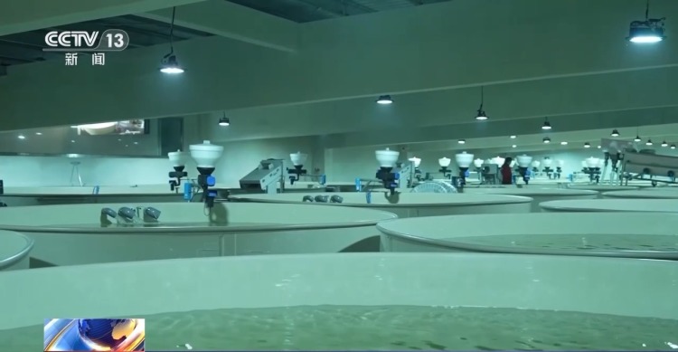 总台记者 崔林欣:这个圆形鱼箱,它的直径是30多米,它的深度是有15米。每个鱼箱当中放置的虹鳟鱼数量有2万多条。在每个鱼箱当中还设置了一些数字化监测设备,能够掌握水体的温度以及溶氧量等数据,方便掌握整个鱼箱当中鱼群的生长状况。