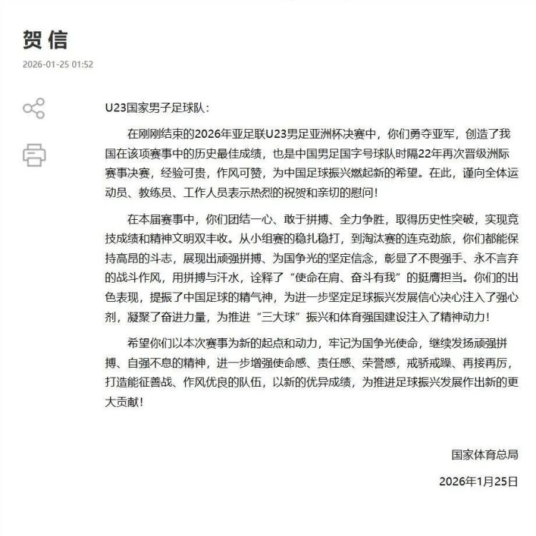 国家体育总局在贺信中表示,U23国足勇夺亚军,创造了我国在该项赛事中的历史最佳成绩,也是中国男足国字号球队时隔22年再次晋级洲际赛事决赛,经验可贵,作风可赞,为中国足球振兴燃起新的希望。