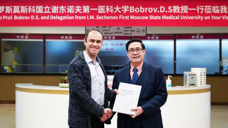 访问尾声,温建民教授将历时三年撰写的80万字专著《中西医结合微创治疗𧿹外翻及相关病症》赠予巴普洛夫教授与丁晨博士。巴普洛夫教授也回赠了来自俄罗斯的纪念礼品,以表敬意。
