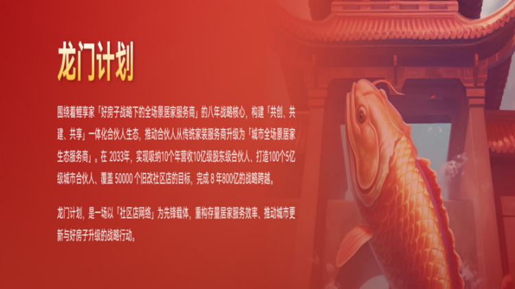 跨年演讲中,程总首次系统阐释了面向2033年的长期战略蓝图——“鲤享龙门计划”。该计划核心是围绕“好房子战略下的全场景居家服务商”定位,构建“共创、共建、共享”的一体化合伙人生态,推动合伙人从传统家装服务商升级为“城市全场景居家生态服务商”。