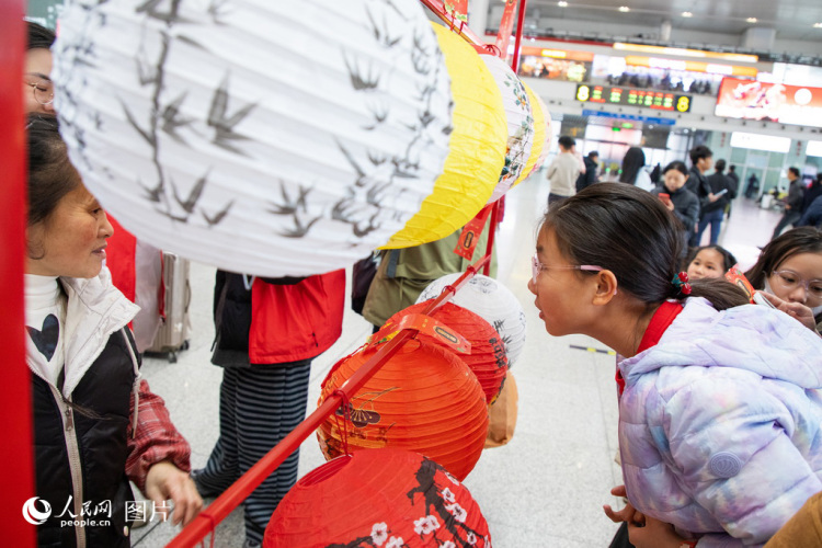 Passengers participate in a lantern-riddle guessing activity in the waiting hall of Fuzhou Railway Station in Fuzhou, southeast China's Fujian Province, on Feb. 2, 2026. (People's Daily Online/Jiao Yan)