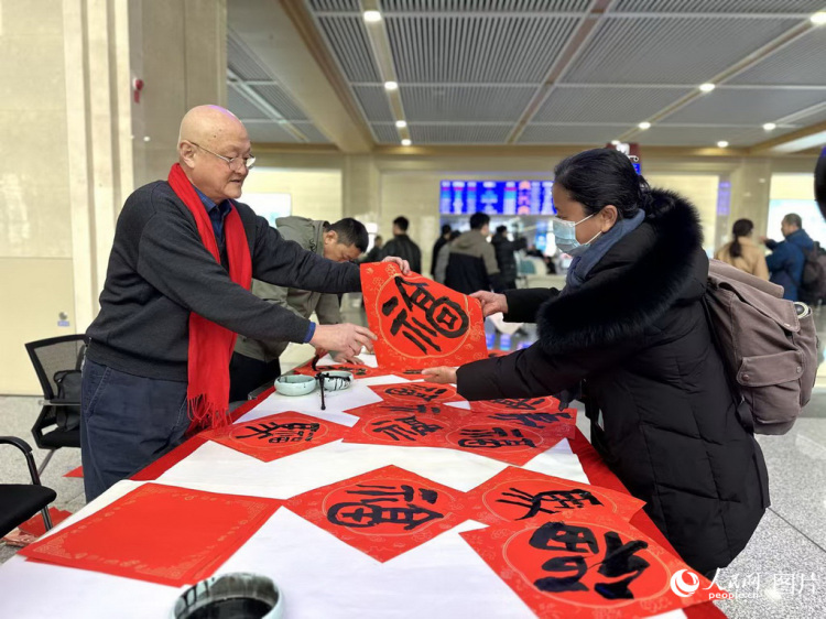 A calligraphy artist presents the Chinese character "Fu", which means good fortune, on a piece of paper, to a passenger at Jinan Railway Station in Jinan, east China's Shandong Province, on Feb. 2, 2026. (People's Daily Online/Qiao Shu)