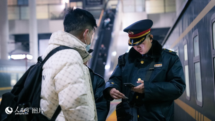 A train attendant checks a passenger's ticket before the latter boards train K1297 at Yinchuan Railway Station in Yinchuan, northwest China's Ningxia Hui Autonomous Region, on Feb. 2, 2026. (People's Daily Online/Liang Hongxin)
