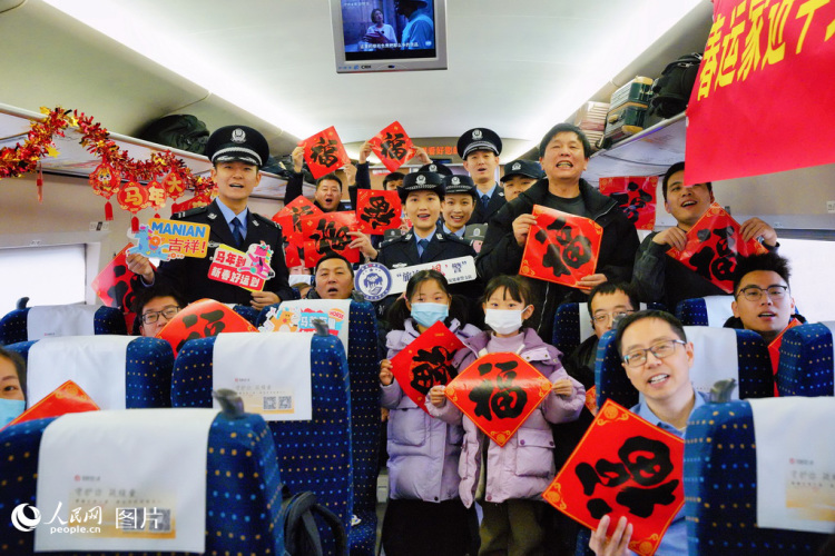 Passengers and railway police pose for a picture at a Spring Festival travel rush-themed activity on train G2815 on Feb. 2, 2026. (People's Daily Online/Xi Biao)