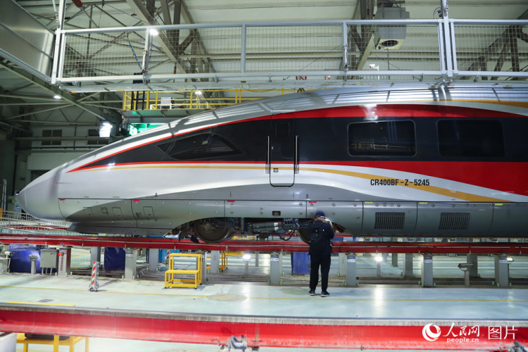 A mechanic inspects equipment on a high-speed electrical multiple unit (EMU) train at a maintenance depot in Lanzhou, northwest China's Gansu Province, on Jan. 30, 2026. (People's Daily Online/Jiao Long)