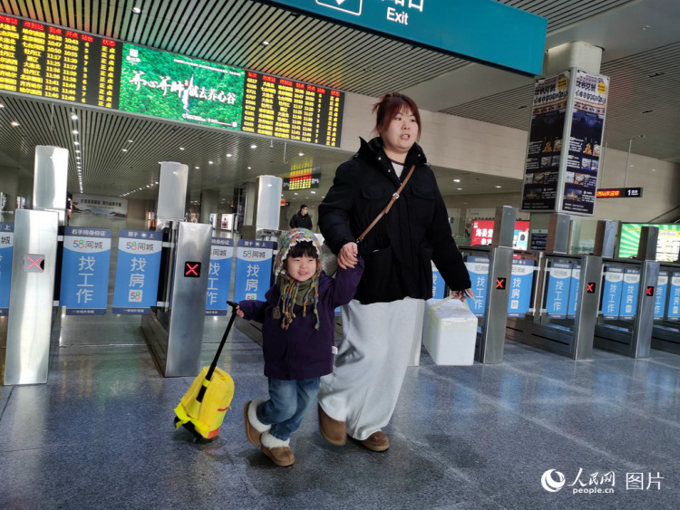 A woman surnamed Yu and her child, from Dalian, northeast China's Liaoning Province, arrive at Changchun West Railway in Changchun, northeast China's Jilin Province, to visit her mother, on Feb. 2, 2026. (People's Daily Online/Wang Diyuan)