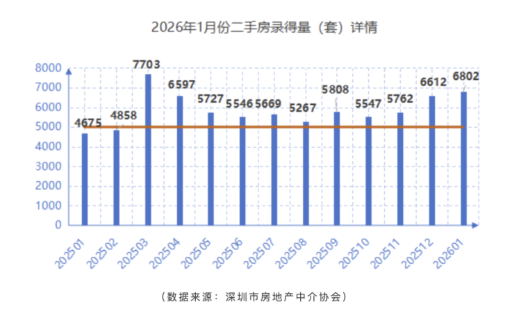 据深圳市房地产中介协会统计数据,2026年1月,深圳二手房共计录得6802套,环比增长2.9%,同比大幅增长45.5%,创近10个月新高。