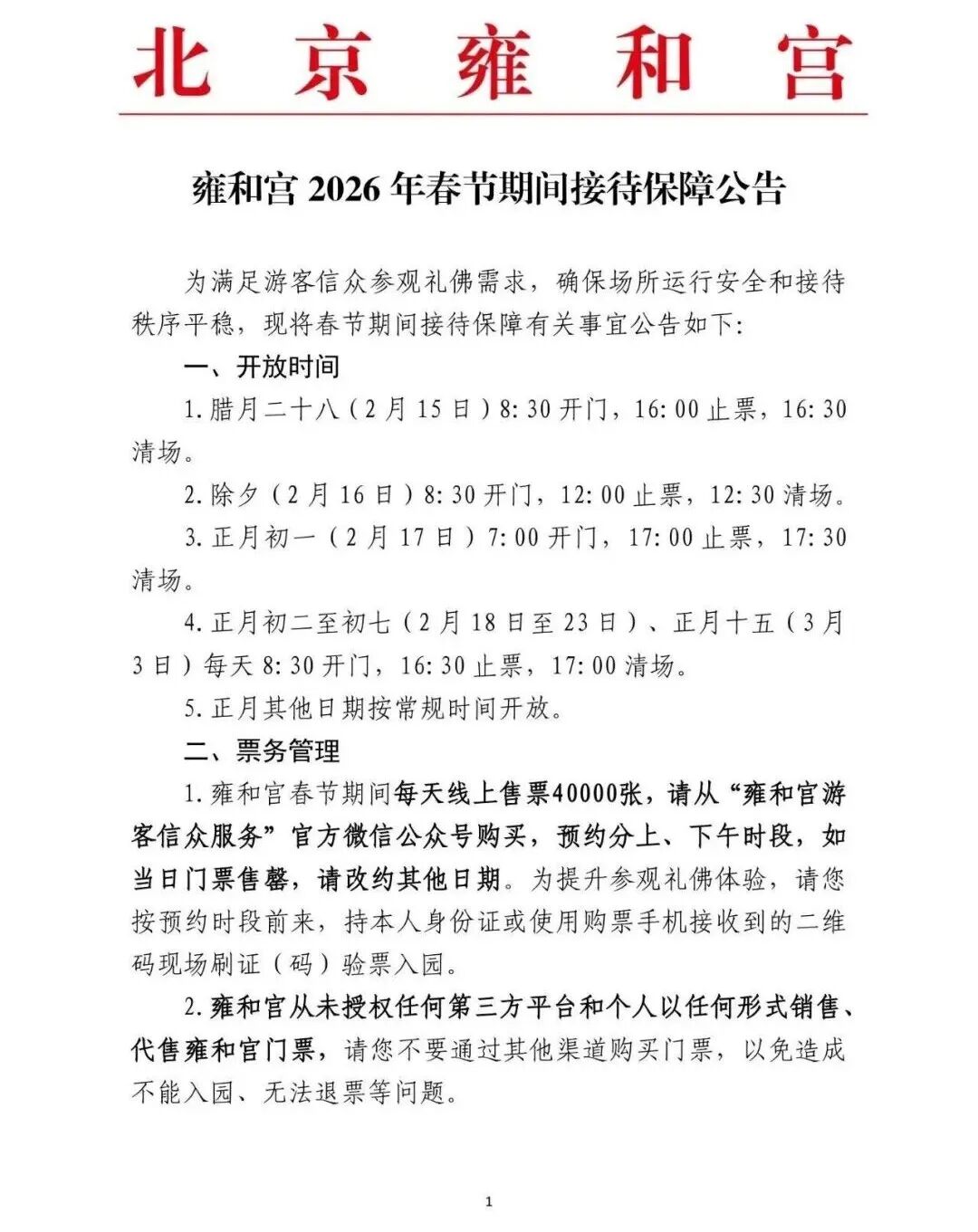 雍和宫2026年春节期间接待保障公告
