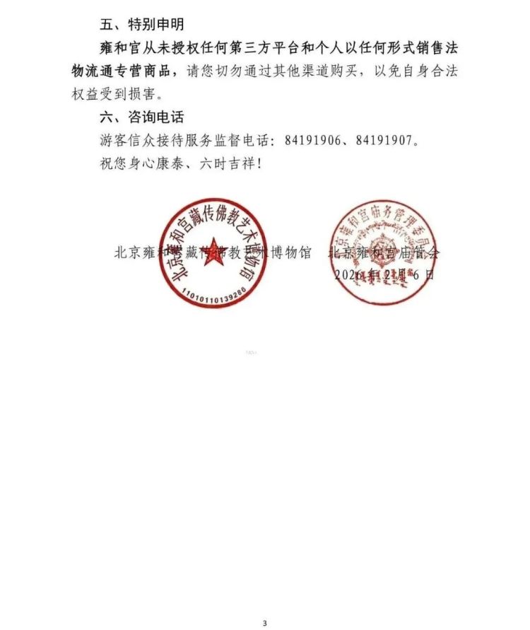 2、雍和宫从未授权任何第三方平台和个人以任何形式销售,代售雍和宫门票,请您不要通过其他渠道购买门票,以免造成不能入园,无法退票等问题。