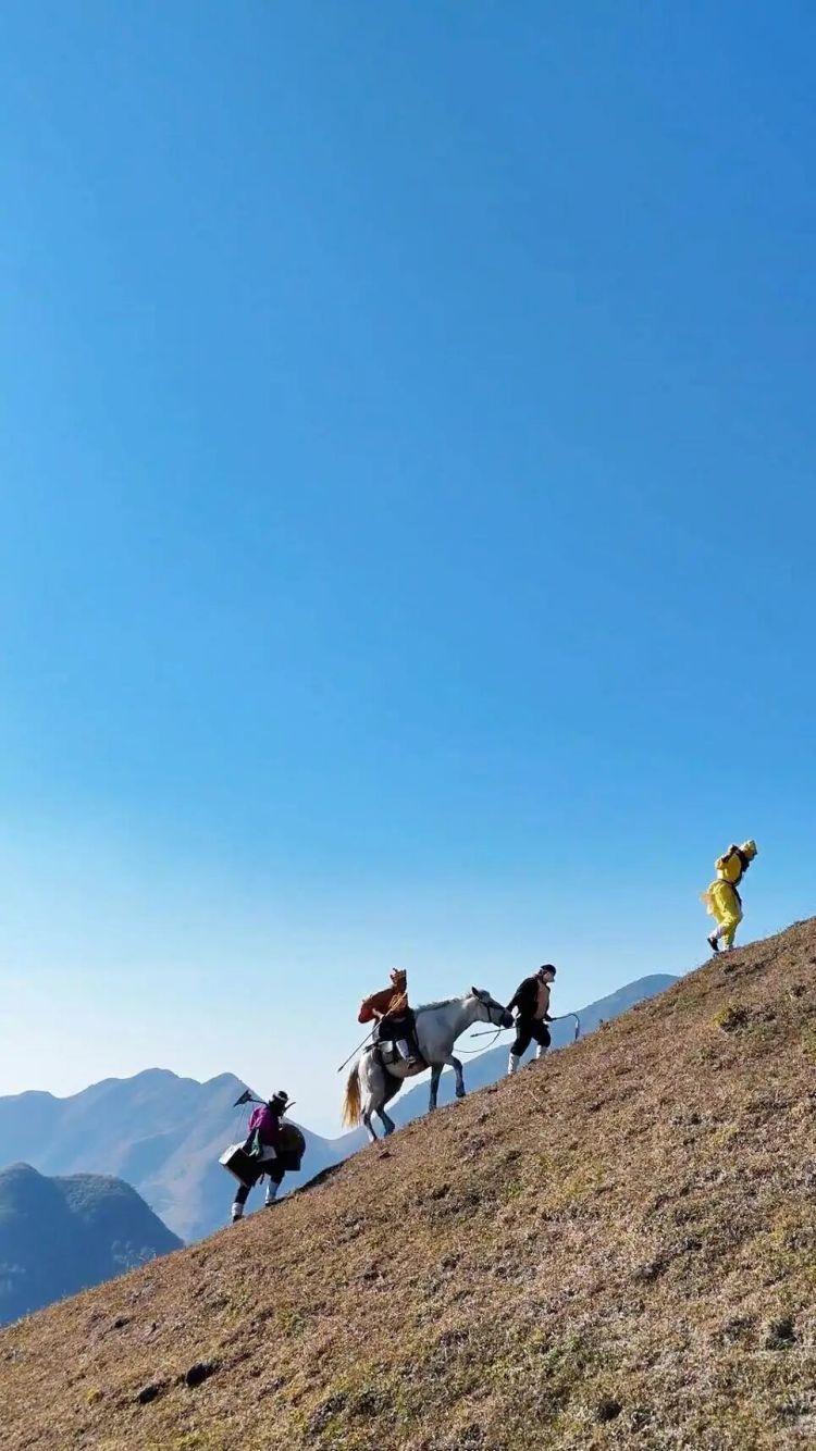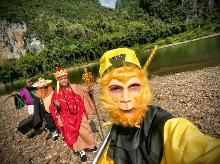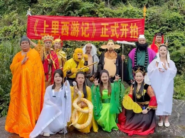 广西玉林北流平政镇,一条小径沿着丘陵往前延伸,两旁是微黄的草地,平时寂静少人。从去年开始,一支奇怪的队伍出现在这条小径上,有人戴着猴毛面具,有人顶着乳胶肚皮,有人挑着两个旧木箱,还有一个穿着袈裟的“唐僧”,骑一匹白马,念叨着:“好险,差点被妖精抓去煲汤。”他们沿着山路走,支起手机、放上音乐,走到哪儿,就拍到哪儿。