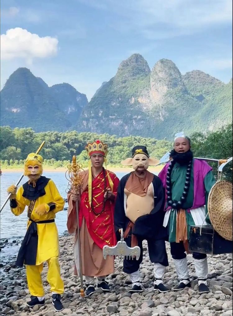 正因如此,视频“露馅”的地方也不少。唐僧念的“经”,有时会变成“你不懂我,我不懂你……”拍特写时,手上的大金戒指总是“抢镜”;猪八戒的乳胶肚皮绑在腰上,走几步就往下滑,露出里面塞着的棉花;沙僧挑着的是两个20斤重的旧木箱,身上那串两斤重的佛珠总被晒得发烫;佛祖会闪现到路边种田,老式二八自行车不时入镜……这些破绽,反倒成了观众最容易记住的细节。