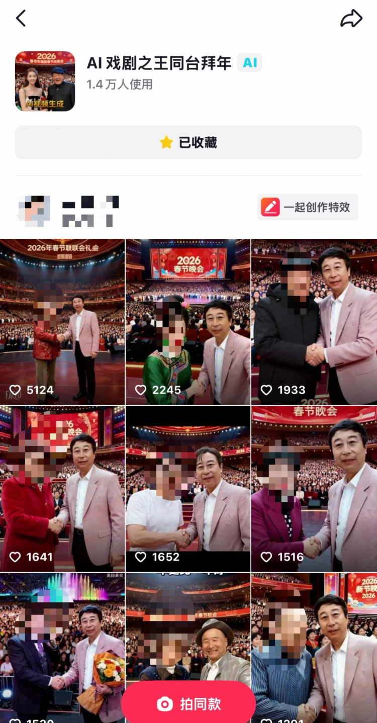 不需要写作复杂的“提示词”,根据网友上传在短视频平台上的AI“特效”模板,点击“拍同款”按钮,连老年人也能轻松生成含有名人明星的AI视频。