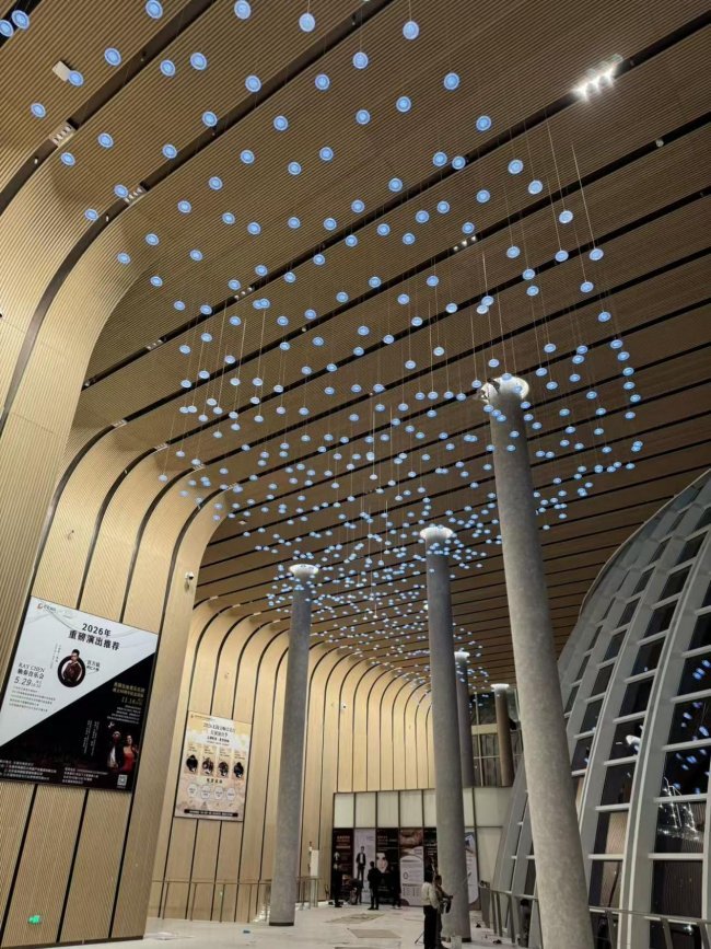面对大厅穹顶等超高区域施工,项目团队组合运用高空作业车与定制化悬挑平台,构建立体化高空作业体系,让施工人员安全、灵活地触及各复杂曲面节点,顺利解决异形吊顶安装的“最后一米”难题,也为后续机电安装与声学测试预留充足空间。