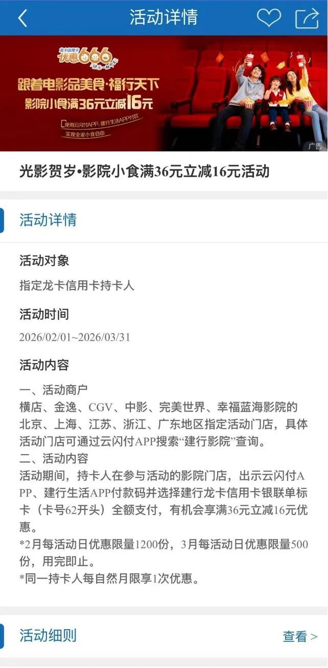 2026年2月1日至2026年3月31日,持卡人在指定活动门店出示云闪付APP、建行生活APP付款码并选择建行龙卡信用卡银联单标卡(卡号62开头)全额支付,有机会享影院小食满36元立减16元优惠。具体活动门店可通过云闪付APP搜索“建行影院”查询。
