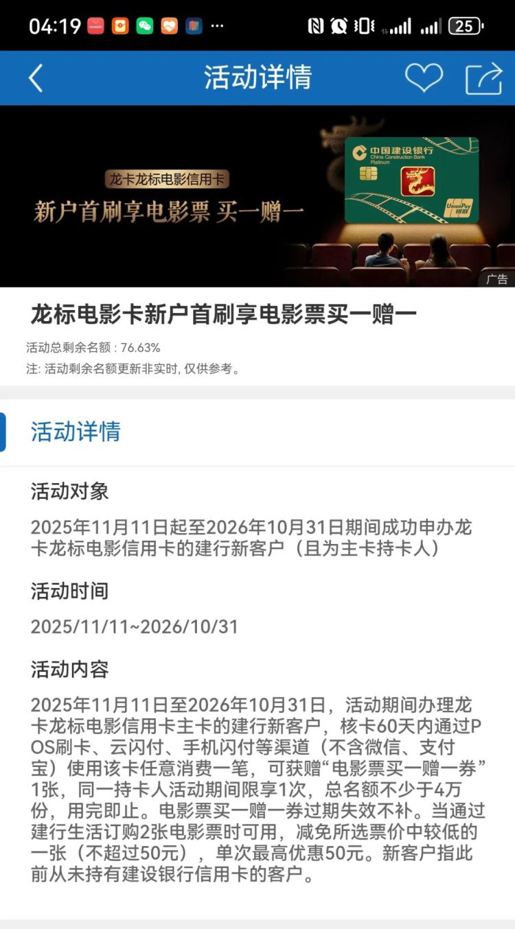 即日起至2026年10月31日,办理龙卡龙标电影信用卡消费达标月月可享“电影票买一赠一券”,通过建行生活App或建行手机银行App订购2张电影票时可用,单笔至高优惠50元。建行手机银行App搜索“龙标”了解详情。