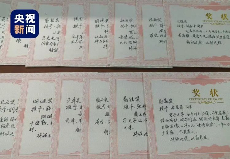 为了这次的奖状,他花了近两周时间构思,对照学生的课堂表现、日常细节,引经据典、字斟句酌。每张奖状的奖项名称、文言评语,都是为孩子量身定制的“专属”。