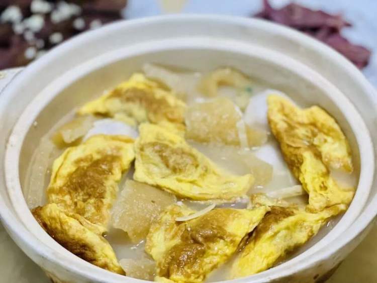 沿袭至今,江南的年夜饭依然讲究“一团和气”。这“和”,是食材的调和,也是人情的聚合。炭火幽幽,高汤滚沸,红火兴旺。特别是汤锅中的蛋饺,如金元宝沉浮:铁勺在炉火上烧热,抹一层猪油,倒入金灿蛋液轻轻一转,迅即放入肉馅,用筷尖轻巧合拢边缘。这过程,火候快一秒则生,慢一秒则焦,全凭指尖分寸的拿捏。一家人的福气,仿佛就包裹在这一个个亲手制成的“元宝”里,在沸腾中交融,吃下去,便是吃下了一整年的安稳与圆满。