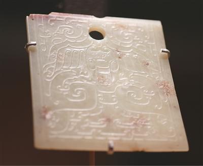 独立展柜中的鹰纹玉钺,是石峁遗址皇城台高等级墓葬中新出土的一件玉器。钺呈倒梯形,边缘一周分布多个可供穿系的小孔,正面减地雕刻精美的鹰纹。鹰首上昂,双翅张开作翱翔状,鹰四周点缀卷云纹。张倩介绍,鹰的形象亦见于石峁遗址陶器中,推测可能是石峁人群的信仰“图腾”。