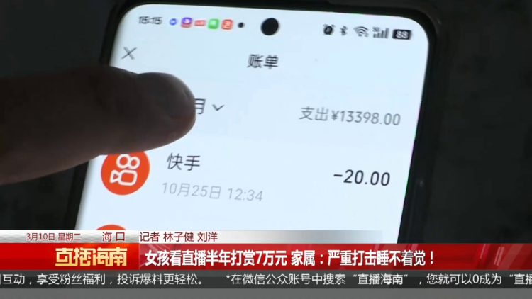 “我妈妈她不是有想去查一下那个养老金吗,然后去银行的时候,工作人员就告知说,家里有人绑定你的银行卡,消费了很多钱。他银行人员没有具体说什么,我妈妈就回来跟我说,卡里面的钱不见了,现在想用钱没有钱在里面,就觉得不对劲。”林女士查询母亲微信的转账记录发现,从2025年9月到2026年2月,大约半年的时间里,母亲的账户陆续向北京快手科技有限公司付款,总计消费约7万元。发现这一情况后,林女士想到了自己的女儿小芳。