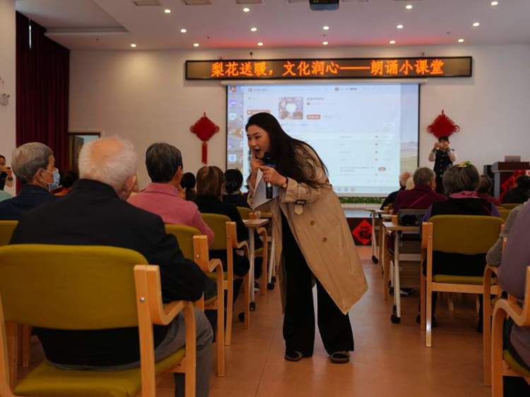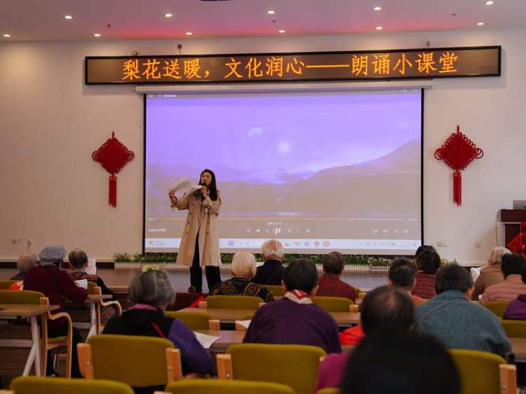活动当天,南山社会福利中心的活动室内暖意融融。50位长者早早落座,眼中满含期待。上午的活动在轻松愉快的氛围中拉开帷幕,来自梨花教育的专业朗诵导师君君走到长者中间,用亲切的话语开启了这场别开生面的朗诵课堂。