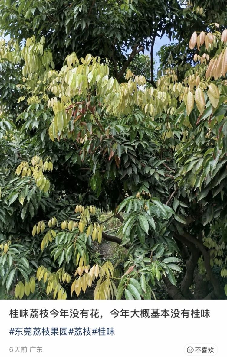 “往年漫山遍野的荔枝花穗,今年稀稀拉拉,连树顶都只剩零星几簇。”“今年桂味一片飘红,全军覆没。”