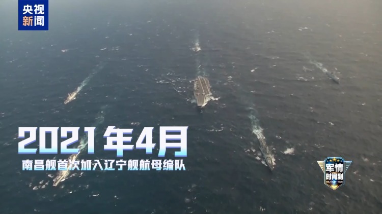 2021年4月,南昌舰首次加入辽宁舰航母编队,执行远海训练任务。任务期间,两艘一路跟监的外舰趁辽宁舰航母编队调整阵位间隙,先后大角度转向,试图穿越正常航行的中国海军舰艇编队。