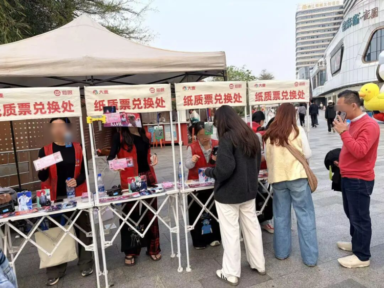 当晚郭富城演唱会在此举行,开场前,从地铁口到会场的必经之路上,分布着多个兜售“纪念票”的摊位。销售人员身穿红色或粉色马甲,摊位上支着红色桌布,悬挂的“演唱会纸质票兑换处”牌子上,赫然印着大麦、猫眼等平台的Logo,极易让消费者认为“这是官方的”。