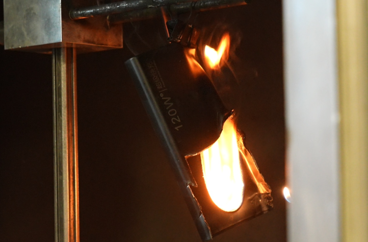 实验室工作人员:火焰应该在30秒内熄灭才算通过,非但没有熄灭,反而越来越大,而且还有滴落物。(按照要求)外壳不能燃尽。