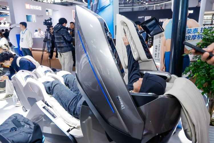 走进荣泰健康的展区,全新发布的RT9000系列按摩机器人占据了展台的“C”位,其独特的双手、双脚独立的造型设计,使其宛如科幻作品中的“机甲驾驶舱”,吸睛无数。环球网记者在现场看到,前来按摩体验的观众络绎不绝,很快就排起了长队。有观众对记者表示,“从来没见过这样的按摩椅,感觉很新奇,想试试和普通造型的按摩椅有什么不一样的地方。”