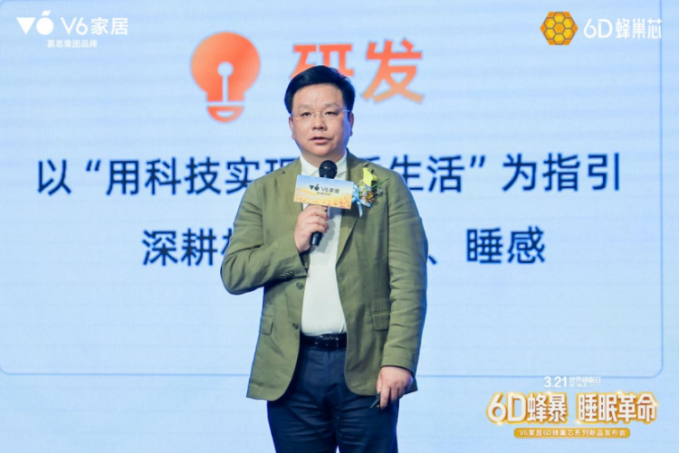 V6家居洞察年轻消费者的消费偏好和消费认知—材料科技才是舒适的根本,用科技造出好产品,让好产品自己说话。正因如此,江涛表示V6家居升级了全新slogan“用科技实现舒适生活”,6D蜂巢芯新品就是在这一理念下研发出的革新睡眠芯材技术的重磅产品。