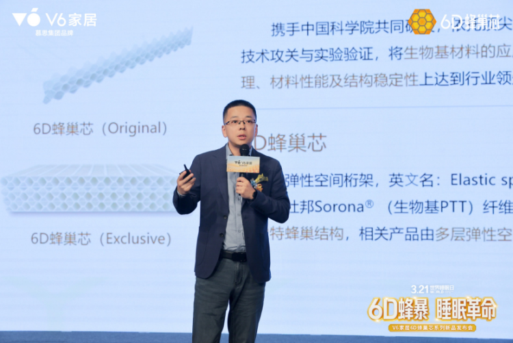 慕思集团CTO陈文泽对6D蜂巢芯的核心技术,从支撑性、透气性、材料优势到绿色环保几个方面进行了深度的发布。