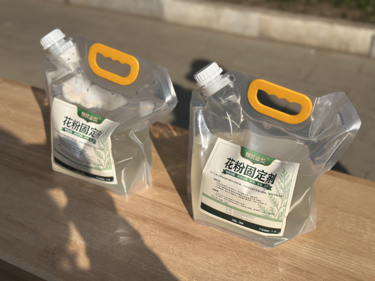 北京农学院植物科学技术学院教授 秦岭:我们把雄球花比喻成一个“大房子”,里面还有很多“小房子”,花粉在“小房子”里特别多。花粉固定剂的作用,一个是在花粉散播的过程中让它沉降下来,第二是把雄球花这个“大房子”包裹住,让它在树上先待一待,晚一点散粉。现在这个时间是两天喷施一次,花粉散播量特别大的时候一天喷施一次。普通的人工喷水一天要喷3-5次,用花粉固定剂后一天喷一次就可以了,因为它有延迟几个小时的作用,节约了人工和用水的成本。