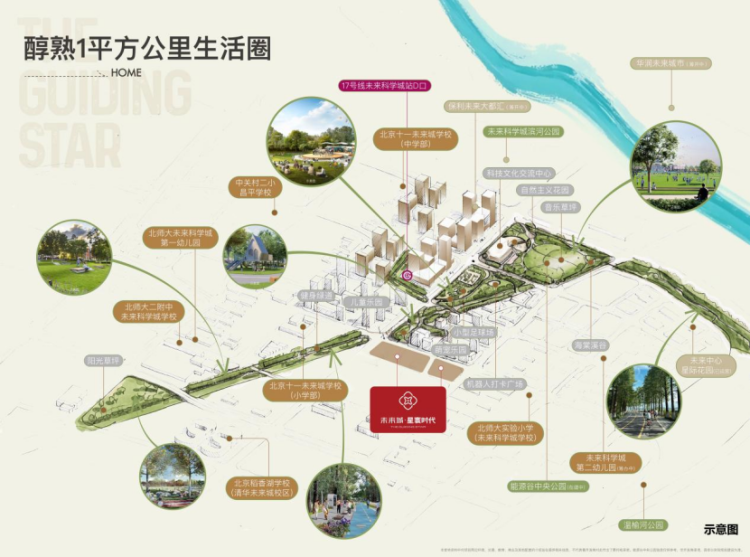 以项目为核心周边10平方公里范围内10余家央企下属200余家分支机构及科研单位齐聚,是全国能源创新要素核心富集区域。约1公里范围内北京十一未来城学校(小学/中学部)、北师大实验小学、北师大二附中、稻香湖学校(清香未来城校区)、北师大未来城第一幼儿园六大全龄优教,涵盖幼儿园至高中(15年学制)成熟教育体系,同频西海教育资源;(具体入学政策以当年教育部门规定为准)约300余米17号线未来科学城站,一站换乘地铁18号线,快速直达海淀上地等区域;4站望京、5站太阳宫、8站工体、10站永安里,半小时高效接驳城市繁华;坐享京承高速、未来科学城路、北清快速路、定泗路、安立路(立汤快速路)(建设中)两横三纵路网;项目一路之隔约30万方能源谷中央公园,约1.5KM范围内,温榆河公园、未来科学城滨水公园,三大公园环绕,让公园陪伴每一天的好心情;山姆会员店昌平店(已运营)、保利未来大都汇(筹开中)、华润未来城市(筹开中)、未来中心星际花园(已运营),出门即享万千繁华。