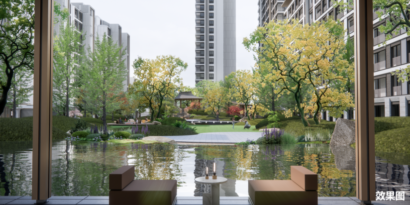 于内,则以“一轴12景,户户见景,步步生花”的造园手法,通过一条景观主轴分为东区和西区,东区以观心亭为中心串联星趣童岩、星语林间等景观节点,西区以星澜湖为中心串联爱心无边草坪、揽月桥等景观节点,形成遥相对望之姿。自东向西,绿意无缝流淌,景致层层递进,让自然成为日常生活的底色,构建繁华都市中的自然谧境。