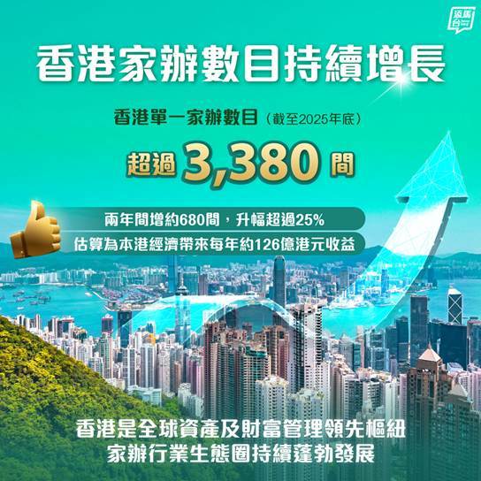 更值得注意的,是财富管理端的爆发式动向。香港投资推广署委托德勤发布的《香港家族办公室市场研究》显示,截至2025年底,香港单一家族办公室数量已超3380间,两年增幅超25%。香港《大公报》称,91%的受访家族办公室已在港开展投资。就此,香港星岛日报网报道称,香港备受家办青睐的原因之一,在于能供应具竞争力的风险管理产品和服务。