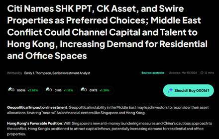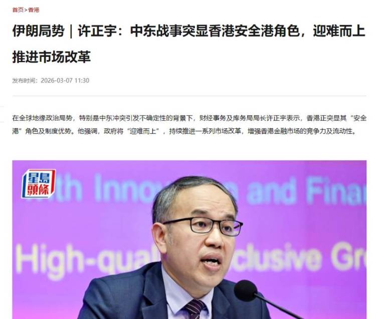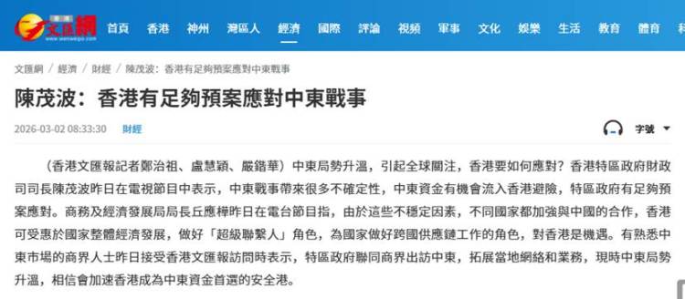 3 月初,香港财政司司长陈茂波在电视节目中公开称,中东战事带来很多不确定性,中东资金有机会流入香港避险,特区政府有足够预案应对。他判断,在地缘政治局势驱动下,金融市场波动加剧、资金流转速度加快,大概率会有部分中东资金将香港作为避险安全港。