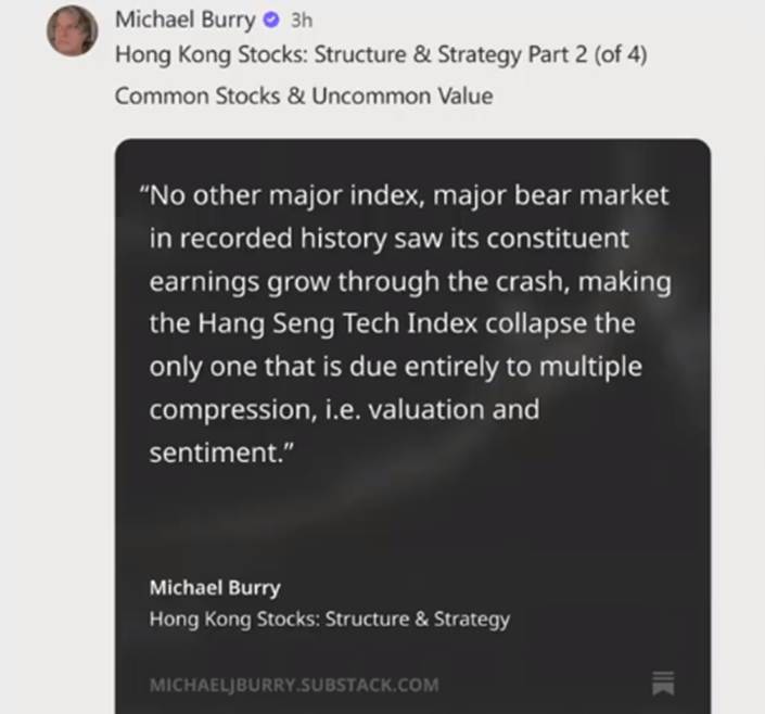 同时,有两则消息在投资圈内发酵。一个是华尔街传奇大空头迈克尔・伯里(Michael Burry)罕见表态,他表示,恒生科技指数此轮下跌,属于历史罕见的纯估值与情绪收缩行情。即便在指数处于熊市阶段时,成分股的营收与利润依然实现了稳健增长。迈克尔·伯里直言,港股市场已经被严重低估。