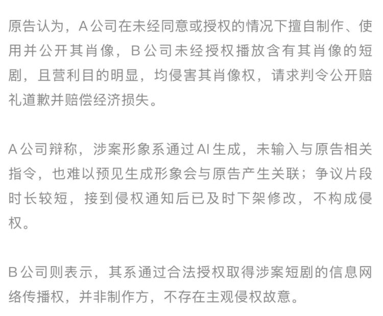 此案原告为国内某知名演员,该演员发现被告A公司制作并发布的短剧中,通过AI换脸技术将其肖像拼接至剧中角色面部,相关话题在多个社交平台引发讨论,大量网络用户误认为原告参与了该剧。与此同时,被告B公司在其运营的视频账号上线涉案短剧。