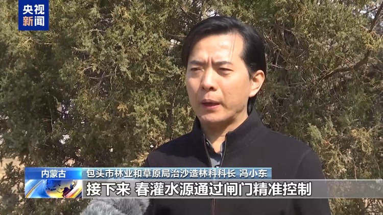 包头市林业和草原局治沙造林科科长 冯小东:有了总水管这条主干“命脉”,接下来春灌水源通过闸门精准控制分流到各个施工作业区,再经过田间的支管、滴灌带等“毛细血管”,最后到达新栽植苗木的根系。