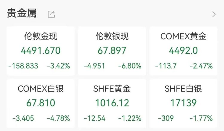 现货白银跌6.8%,报67.897美元/盎司,本周累计下跌超15%;COMEX白银期货跌4.78%,报67.810美元/盎司,本周累跌超16%。