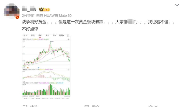 “我不买的时候,身边人都说买黄金赚了,怎么我一上车,金价就跌了?难道真是被我买崩了?”3月18日晚上9点多,杭州90后投资者郑先生边刷着中东局势,边盯着黄金行情,忍不住在投资群里接连发问。