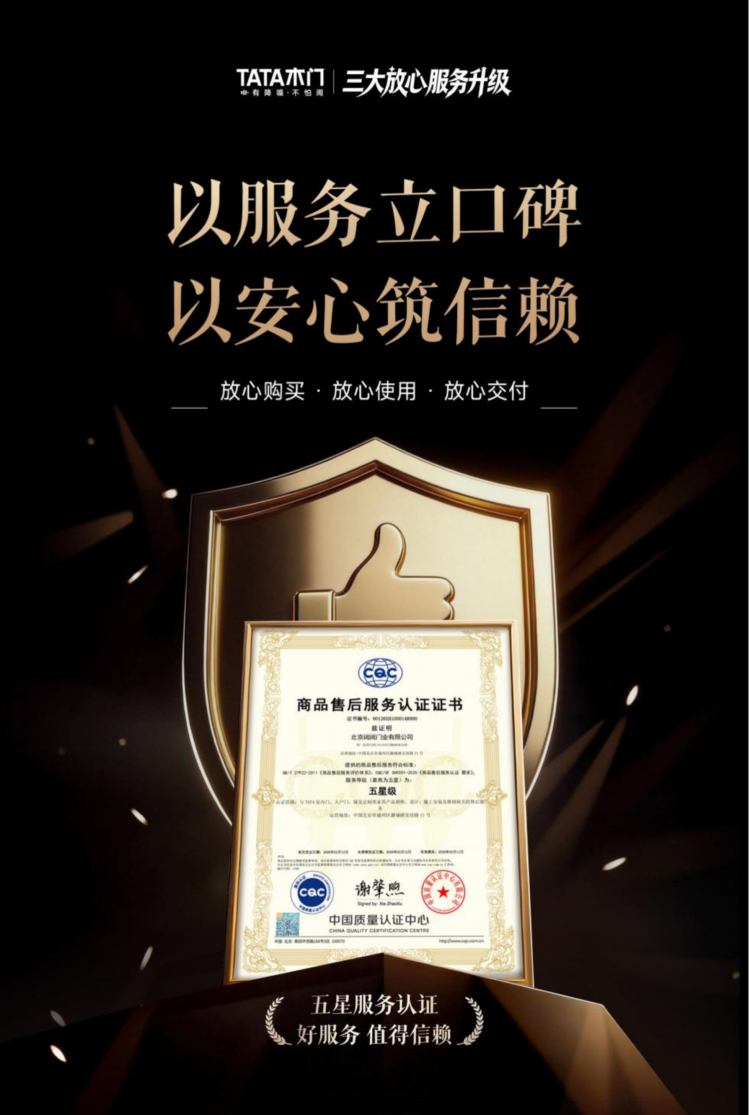 在追求极致服务的道路上,TATA木门并未止步于企业内部的自我要求,而是选择主动接受行业最高规格的“体检”。近期,TATA木门、TATACASA、锦上宅三大品牌同时获得了中国质量认证中心(CQC)颁发的五星级商品售后服务认证证书,标志着其服务体系获得国家权威认可。