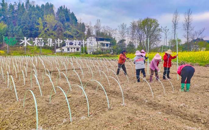 “薄膜还拉过来一点,压土的时候要小心一些,莫压坏了秧芽。”守在一旁的种粮大户向森林,看着20多亩秧田里支起的一行行整齐划一的育秧拱棚,眼中满是期待,“这些秧苗长起来后上机插秧,周边350多亩的稻田就不愁秧了。”