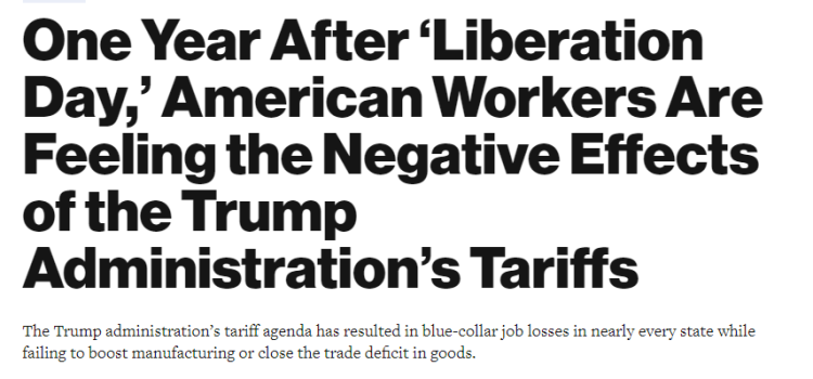文章最后写道,迄今为止,除了推高物价、造成失业、破坏国际信任、导致小企业破产激增之外,特朗普政府的贸易政策究竟取得了什么成果?答案是:几乎没有。特朗普政府未能实现其寻求的成果,反而造成更具破坏性的惊人高昂代价。