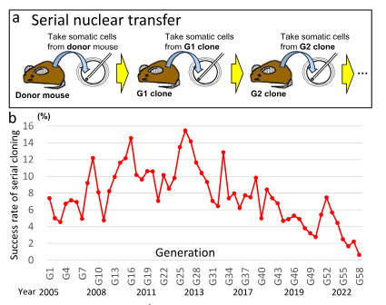 为了回答这个问题,山梨大学科研团队将实验持续了20年。他们对小鼠进行了一代又一代的连续克隆:从最初的个体中取出体细胞,将其细胞核移植到去核的卵母细胞中,培育出克隆个体,再从这个克隆个体身上取材,进行下一轮克隆,如此循环往复。