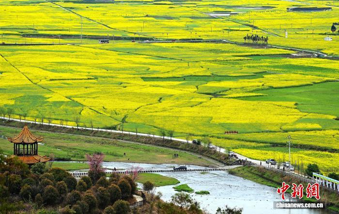 清明前的雨后,重庆市秀山土家族苗族自治县平江河中下游一带,河水被三座古老的拦河坝徐徐揽住,一部分顺堰脊缓缓滑落,另一部分则流入渡槽滋养两岸沃土。溯流而上,数万亩油菜花田宛如一块绿黄交织、巨大而整齐的调色板,于狭长的平原之上铺展。