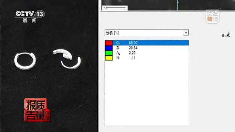 直播间里宣称“通体纯银”,印有“足银999”钢印的这款耳环,检测发现仅在表面镀了一层薄银,表面银含量仅为22%左右,截面银含量更是不足1%。其主体主要由铜、锌、镍合金组成,铜的含量是60%,锌是30%左右。
