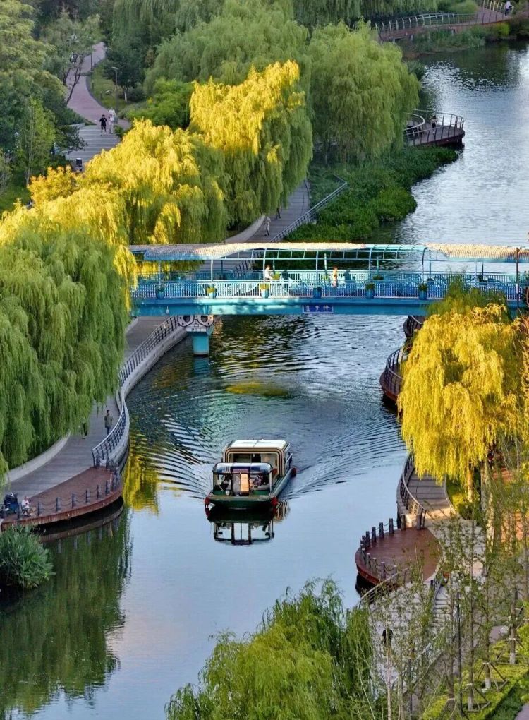 河岸春花初绽,新柳依依,水面开阔,风光清新。乘汉唐风格电动画舫,赏两岸春日花海,看桥影横波,在宁静水城间,邂逅一段温柔的水上赏花时光。