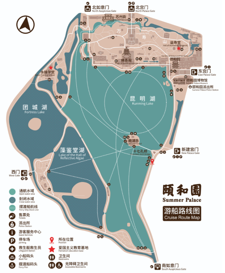 码头位置:东岸码头、西岸码头、北岸码头、琳光殿码头、北岸大摆渡码头、漪澜堂大摆渡码头