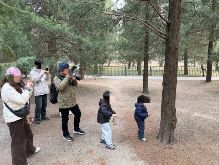 记者周末走访发现,在陶然亭公园,一些景观石上摆放着花生、核桃等坚果,不断有松鼠跳下树来进行“搬运”;在奥森公园,一位摄影师无视“禁止诱拍鸟类及野生动物”的警示牌,撒下好几把杂粮;在天坛公园,因松鼠数量众多,投喂现象更加普遍,不少家长趁着节假日,带着孩子、拎着食物,穿梭在林间寻找、投喂松鼠。